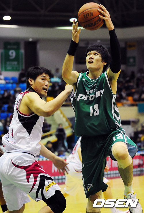28일 오후 원주 치악 체육관에서 열린 '2011~2012 KB국민카드 프로농구' 윈주 동부와 창원 LG의 경기에서 2쿼터 동부 윤호영이 LG 서장훈의 블로킹을 피해 점프슛을 시도하고 있다.