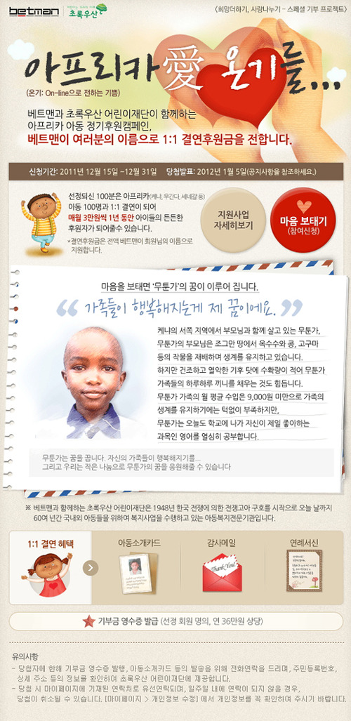 먼저 '아프리카愛 온기를…' 캠페인은 '희망더하기, 사랑나누기' 캠페인의 스페셜 기부 프로젝트로 가난으로 고통받는 아프리카 어린이들을 돕기 위해 마련됐다. 캠페인에 참여하고자 하는 회원들은 베트맨에 로그인한 후 '희망더하기, 사랑나누기' 페이지에 마련된 스페셜 기부 코너에서 '참여하기'를 클릭하면 된다. 신청자 가운데 총 100명을 선정해 케냐, 우간다, 세네갈 등에 거주하는 아프리카 어린이 100명과 1:1을 결연을 맺고, 어린이 1명당 매달 3만원씩 1년 동안 총 36만원의 후원금을 전달하게 된다. 결연 후원금은 전액 베트맨이 회원의 이름으로 지원할 예정이다.