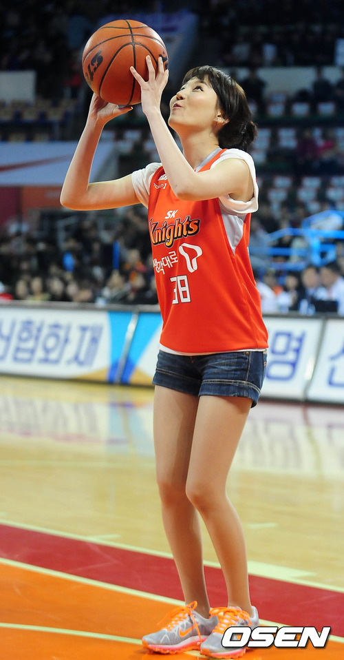 31일 오후 잠실학생체육관에서 열린 '2011-2012 KB국민카드 프로농구' 서울 SK와 울산 모비스의 경기 시작 전, KBS N 스포츠 아나운서 장새별이 시투를 하고 있다.