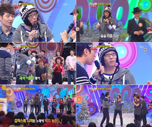유재석이 SBS ‘일요일이 좋다-런닝맨(이하 런닝맨)’ 촬영 도중 SBS ‘도전1000곡’에서 노래를 불렀다.