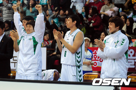 1일 오후 안양 실내체육관에서 열린 '2011-2012 KB국민카드 프로농구' 안양 인삼공사와 원주 동부의 경기 4쿼터 동부가 역전하자 선수들이 기뻐하고 있다.