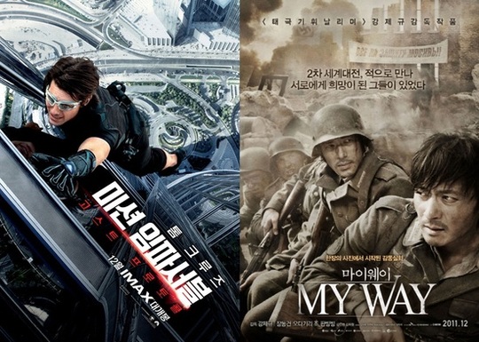 외화 '미션 임파서블:고스트 프로토콜(미션임파서블4)'과 한국영화 '마이웨이'가 국내 박스오피스 1, 2위를 기록 중인 가운데, 이들이 극장가 파이를 키우며 '윈-윈'하고 있다기 보다는 '마이웨이'가 '미션 임파서블4'에 밀리고 있다는 시각이 크다.