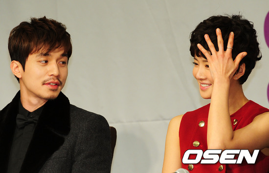 이동욱 이시영이 간담회 도중 이야기를 나누고 있다.