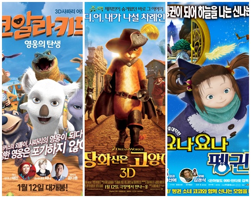 국내 기술력으로 완성된 3D 애니메이션 ‘코알라 키드 : 영웅의 탄생’과 슈렉 외전 ‘장화신은 고양이’, 일본 애니메이션의 거장 린 타로 감독의 ‘요나요나 펭귄’ 세 작품이 오는 12일 동시에 개봉하는 것.