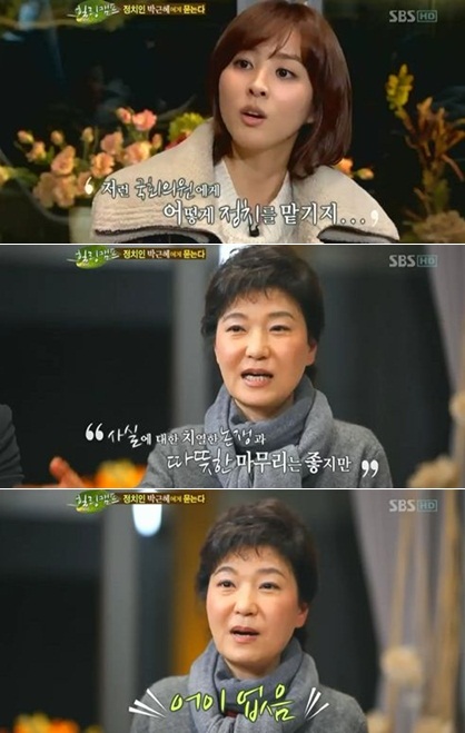 박근혜 한나라당 비상대책위원장이 SBS 예능프로그램 '힐링캠프, 기쁘지 아니한가(이하 힐링캠프)'에 출연해 정치인들의 이중적 태도를 비난했다.