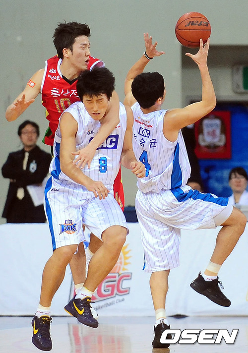 3일 오후 안양 실내체육관에서 열린 '2011-2012 KB국민카드 프로농구' 안양 인삼공사와 전주 KCC의 경기 1쿼터 인삼공사 박찬희와 KCC 정민수가 몸싸움을 벌이고 있는 가운데, KCC 추승균이 리바운드 볼을 잡고 있다.