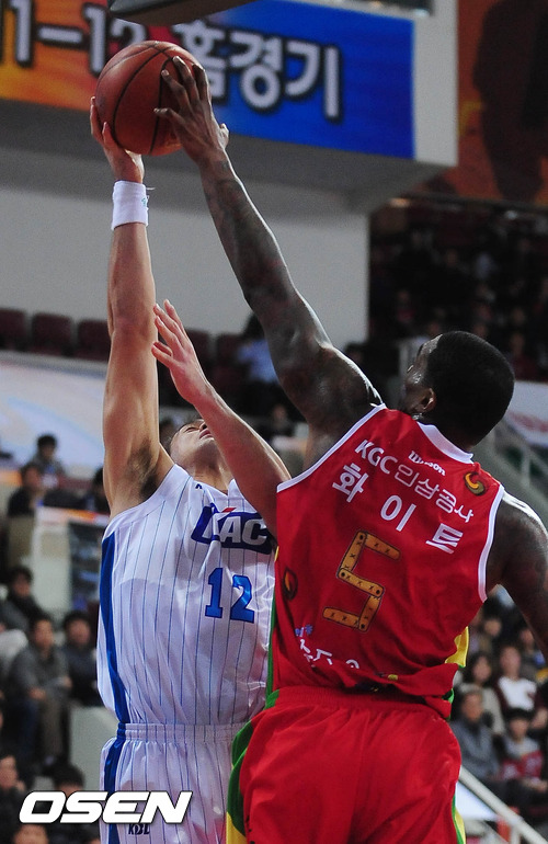 3일 오후 안양 실내체육관에서 열린 '2011-2012 KB국민카드 프로농구' 안양 인삼공사와 전주 KCC의 경기 3쿼터 인삼공사 화이트가 KCC 김태홍의 슛을 브로킹하고 있다.