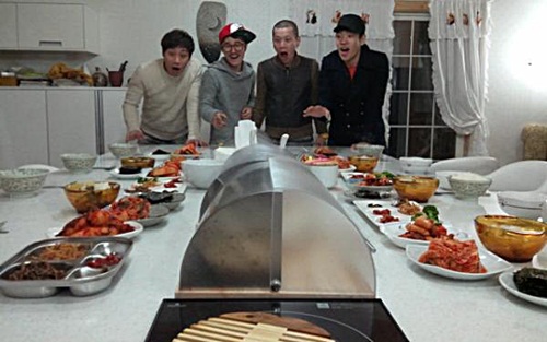 사진 속 임윤택을 비롯한 울랄라세션 멤버들은 한 상 잘 차려진 테이블 끄트머리에 나란히 서있다. 그들은 여러 종류의 반찬들을 바라보며 놀란 입을 다물지 못한 모습이다.