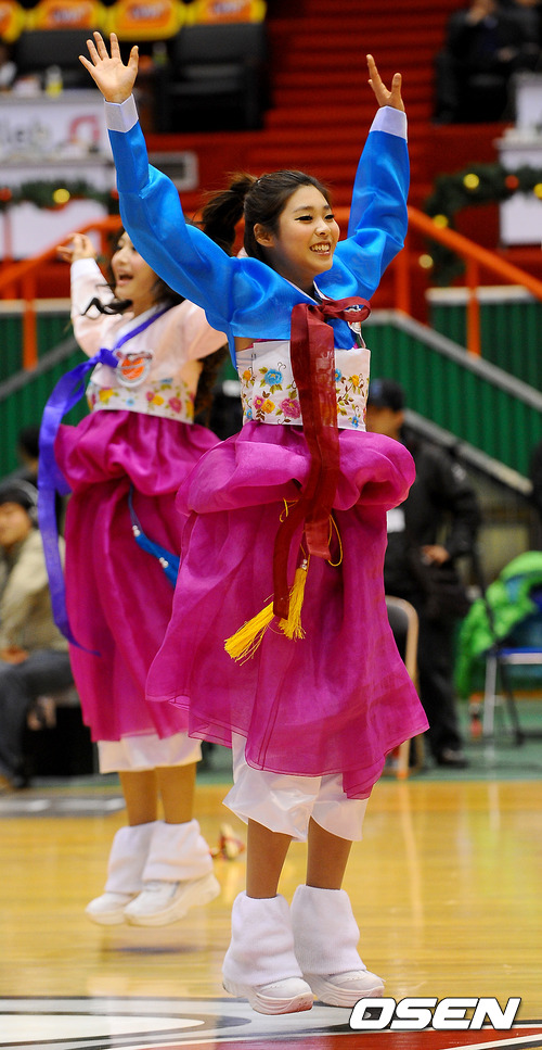 4일 오후 부산 사직실내체육관서 열린 2011-2012 KB국민카드 프로농구 부산 KT와 서울 SK의 경기전 KT 치어리더가 한복을 입은채 새해맞이 댄스를 보이고 있다.
