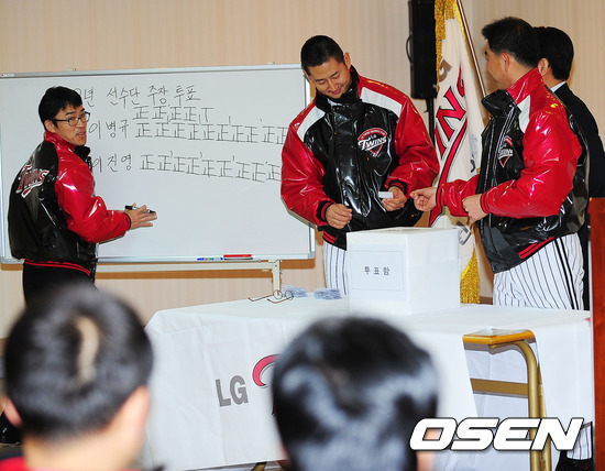 시무식과 함께 올 시즌 선수단을 이끌 새 주장도 선출됐다. LG는 지난 2010시즌부터 2년 동안 박용택(33)이 주장으로 있었으며, 이번 새 주장 후보로는 '적토마' 이병규(38)와 '국민 우익수' 이진영(32)이 나서 개표 결과 이병규가 주장 완장을 찼다. / rumi@osen.co.kr