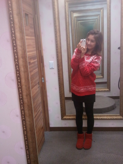 사진 속 남지현은 거울이 연이어 있는 독특한 방 안에서 자신의 핸드폰으로 사진을 찍고 있다. 빨간색 니트와 어그부츠가 귀여워 보는 이들의 미소를 자아내고 있다.