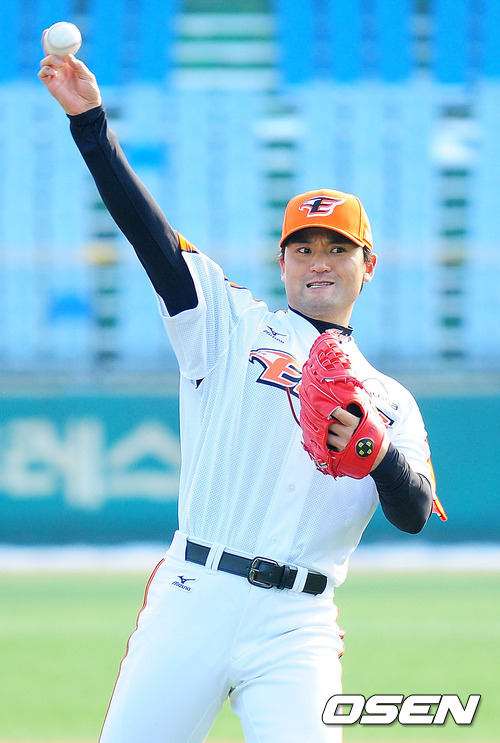 6일 오전 대전 한밭구장에서 열린 한화 이글스 시무식을 마치고 박찬호가 캐치볼 훈련을 하고 있다.