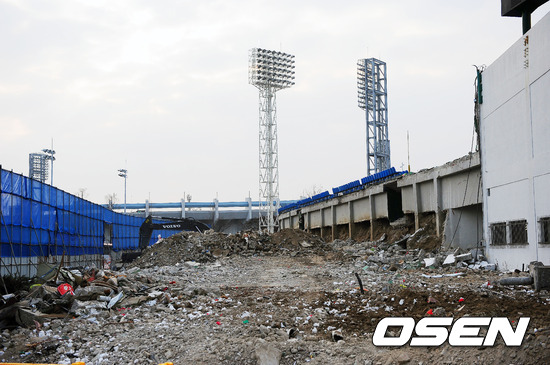 6일 오전 대전 한밭구장에서 열린 한화 이글스 시무식 중 한밭야구장의 공사가 한창이다.