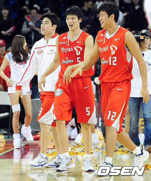 6일 오후 서울 잠실학생체육관에서 열린 '2011-2012 KB국민카드 프로농구' 서울 SK와 창원 LG의 경기 종료 후 SK 김선형과 한정원이 기뻐하고 있다.