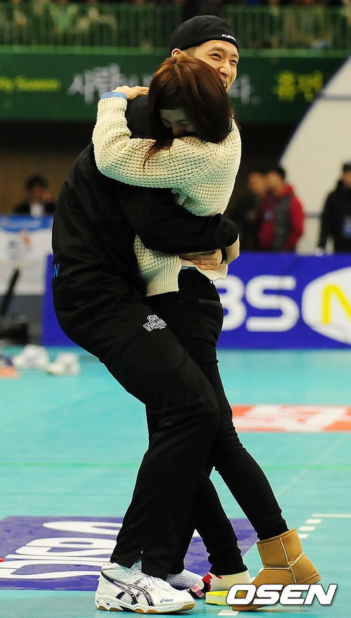 8일 오후 수원실내체육관에서 열린 NH농협 2011-2012시즌 V-리그 올스타전에서 본경기전 팬과 함께하는 명랑 운동회에서 문성민이 팬과 함께 풍선을 터트리기 위해 포옹을 하고 있다.