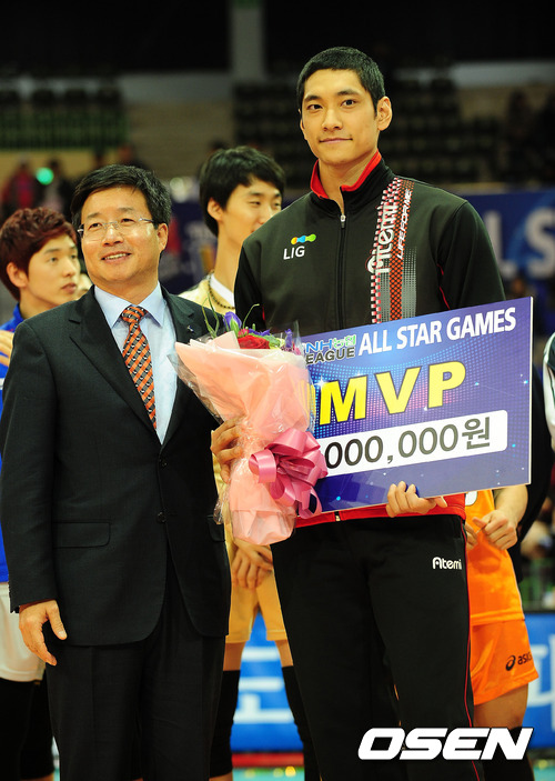 8일 오후 수원실내체육관에서 열린 NH농협 2011-2012시즌 V-리그 올스타전을 마치고 남자 MVP로 선정된 김요한이 포토타임을 갖고 있다.