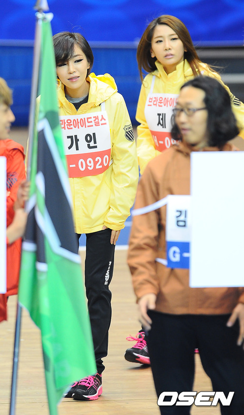 8일 오후 서울 잠실실내체육관서 진행된 MBC '제 4회 아이돌스타 육상·수영 선수권대회'의 녹화현장, 개회식에서 뒤늦게 도착한 브아걸 가인과 제아가 입장하고 있다.