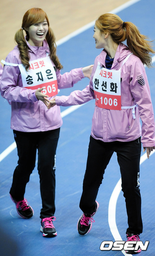 8일 오후 서울 잠실실내체육관서 진행된 MBC '제 4회 아이돌스타 육상·수영 선수권대회' 녹화현장에서 시크릿 송지은, 한선화가 이야기를 나누고 있다.
