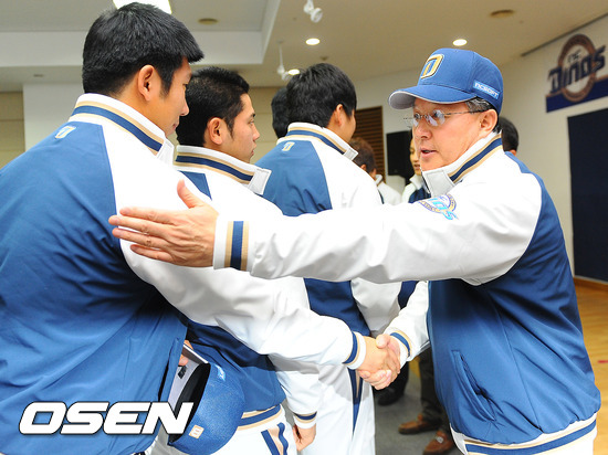 11일 오전 경남 창원 마산회원구 3.15 아트센터 1층 국제회의장에서 진행된 NC다이노스 첫 시무식에서 NC다이노스 김경문 감독이 선수들과 인사를 나누고 있다.