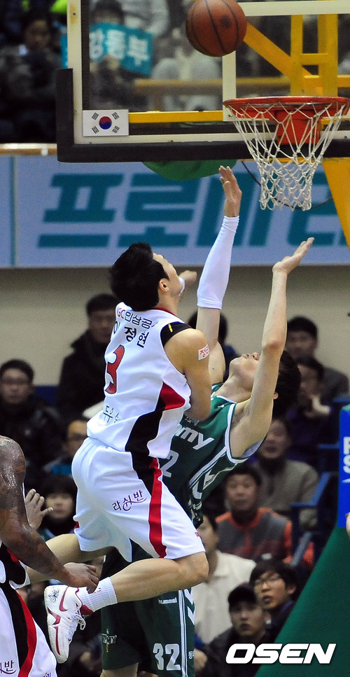 11일 오후 원주 치악체육관에서 열린 '2011-2012 KB국민카드 프로농구' 원주 동부와 안양 인삼공사의 경기 인삼공사 이정현이 동부 김주성을 앞에두고 슛을 시도하고 있다.
