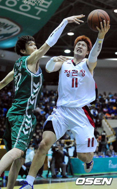 11일 오후 원주 치악체육관에서 열린 '2011-2012 KB국민카드 프로농구' 원주 동부와 안양 인삼공사의 경기 3쿼터 인삼공사 양희종이 동부 김주성을 피해 레이업을 시도하고 있다.