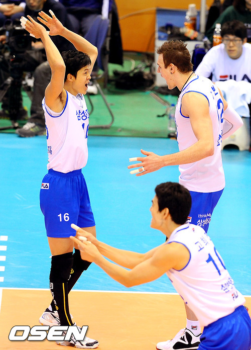 11일 오후 대전 충무체육관서 열린 2011-12시즌 NH농협 V리그 삼성화재와 드림식스의 경기에서 2세트 삼성화재 가빈이 득점 성공한후 홍정표와 하이파이브를 하고 있다.
