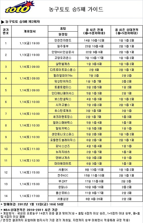 한편, KBL에서는 13일 오후 7시 전자랜드-동부(1경기)전에서 선두 동부가 승리할 것(62.95%)이라는 전망이 가장 높게 집계됐다. 같은 날 KGC-오리온스(2경기)전에서는 2위 KGC가 오리온스에 승리할 것(71.43%)으로 예상됐다. 농구토토 승5패 2회차 게임은 13일 오후 6시 50분에 발매가 마감된다.