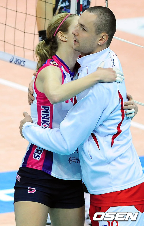 12일 오후 수원 실내체육관에서 열린 '2011-2012 NH농협 V리그' 여자부 현대건설과 흥국생명의 경기 종료 후 흥국생명 미아와 KEPCO 안젤코가 포옹을 나누고 있다.