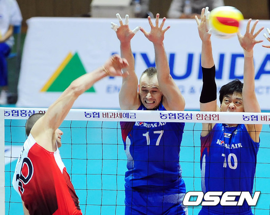 12일 오후 수원 실내체육관에서 열린 '2011-2012 NH농협 V리그' 남자부 KEPCO와 대한항공의 경기 1세트 KEPCO 안젤코가 스파이크를 날리고 있다.