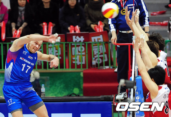 12일 오후 수원 실내체육관에서 열린 '2011-2012 NH농협 V리그' 남자부 KEPCO와 대한항공의 경기 4세트 대한항공 마틴이 스파이크를 시도하고 있다.