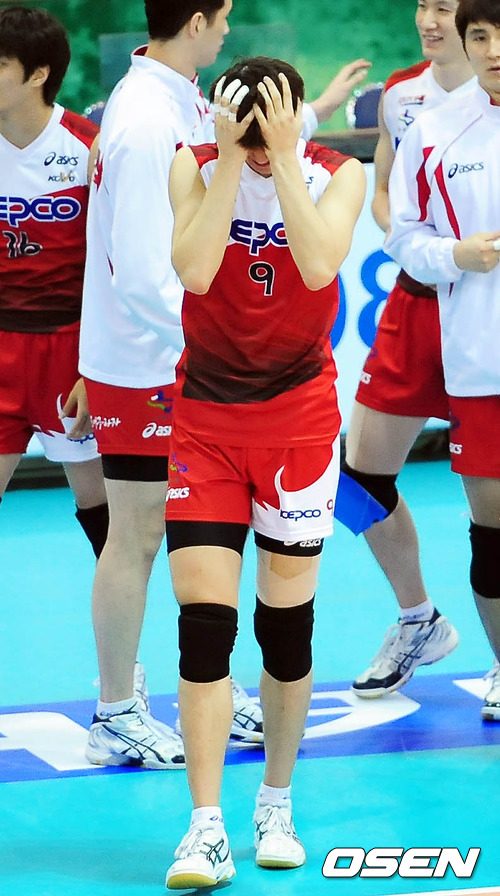 12일 오후 수원 실내체육관에서 열린 '2011-2012 NH농협 V리그' 남자부 KEPCO와 대한항공의 경기 종료 후 KEPCO 최석기가 고개를 숙인체 코트를 빠져나가고 있다.