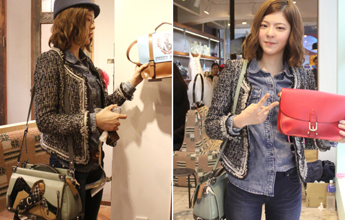 사진 속 장재인이 들고 있는 가방은 민트색과 진한 갈색이 조화롭게 어우러져 있으며, 말그림이 있는 것이 이색적이다.