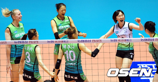 14일 오후 서울 장충체육관에서 열린 '2011-2012 NH농협 V리그' 여자부 GS칼텍스와 흥국생명의 경기 2세트 GS칼텍스가 득점에 성공하자 선수들이 기뻐하고 있다.