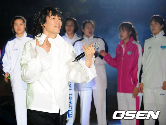 15일 오후 부천 실내 체육관에서 열린 신세계 이마트 2011~2012 여자프로농구 올스타전에서 올스타전에서 116-116으로 나란히 무승부를 기록했다. 경기를 마치고 가수 김장훈이 여자프로농구 올스타 선수들과 함께 공연을 즐기고 있다.