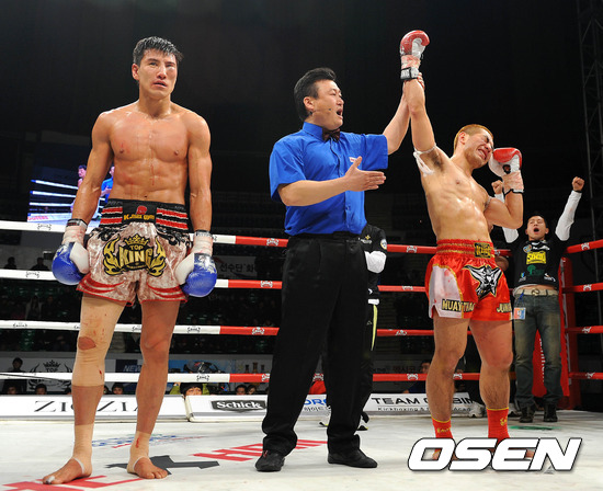 15일 서울 중구 장충체육관에서 벌어진 입식격투기 이벤트 '더칸 3-NEW GENERATION' 70KG 결승전 경기 최우영이 노재길을 꺾고 판정승을 거두고 있다.