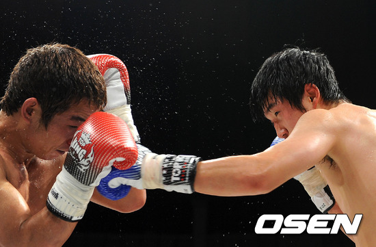 15일 서울 중구 장충체육관에서 벌어진 입식격투기 이벤트 '더칸 3-NEW GENERATION' 65KG 경기에서 이성현이 박병규에게 펀치를 날리고 있다.