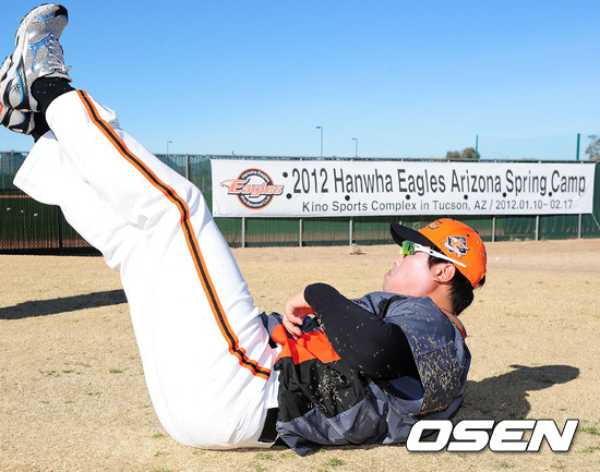 19일(한국시간) 미국 애리조나주 투산 '키노 스포츠 콤플렉스'에서 진행된 2012 한화 애리조나 스프링캠프에서 류현진이 훈련을 받고 있다.
