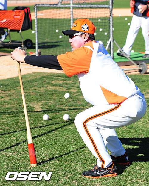 19일(한국시간) 미국 애리조나주 투산 '키노 스포츠 콤플렉스'에서 진행된 2012 한화 애리조나 스프링캠프에서 캐치볼 훈련을 하던 한대화 감독이 몸을 풀고 있다.