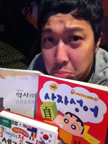 사진 속 하하는 중학교 역사 교과서와 표지에 만화 캐릭터 짱구가 그려진 어린이 사자성어 책 등을 들고 얼굴 살짝 찡그리고 입을 삐죽 내밀었다.