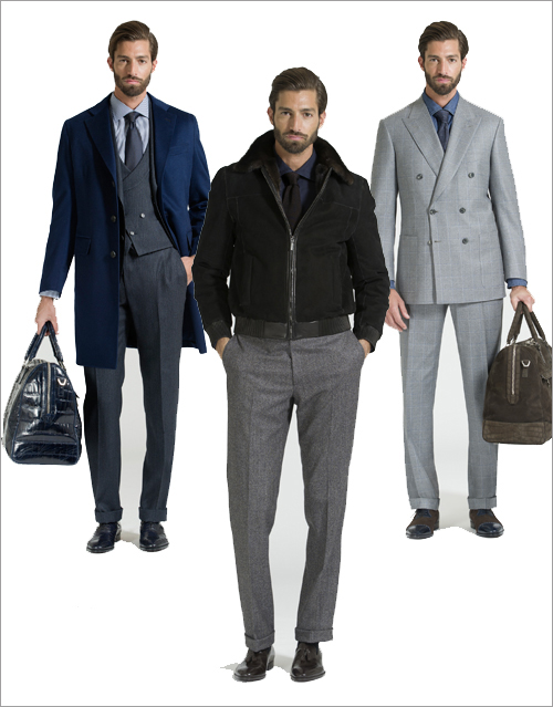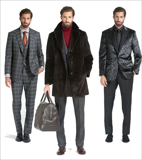 몸에 잘 맞게 재단된 쓰리피스 슈트는 더블브레스트 베스트, 밍크로 라인을 덧댄 양면 캐시미어 코트와 함께 매치하여 근사한 조화를 이뤘다. 늦은 저녁 시간의 외출이나 사교모임에서 입을 수 있는 포멀한 슈트로는 자카드나 벨벳 턱시도, 실크나 울 소재를 사용한 앤틱 골드 디테일의 칵테일 재킷 등이 선보였다.