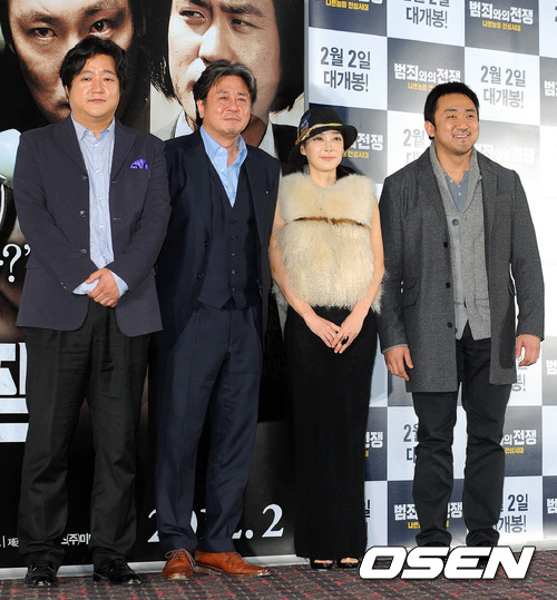 19일 오후 서울 CGV 왕십리에서 진행된 영화 '범죄와의 전쟁' (감독 윤종빈) 언론시사회에서 배우 곽도원, 최민식, 김혜은, 마동석이 포토타임을 갖고 있다.