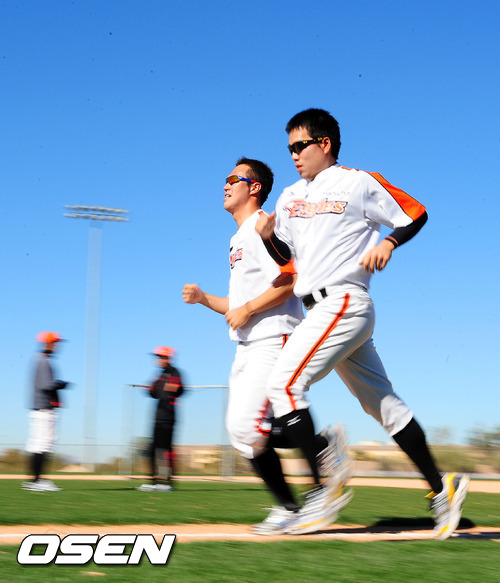 20일(한국시간) 미국 애리조나주 투산 '키노 스포츠 콤플렉스'에서 진행된 한화 스프링캠프에서 장민제 정민혁이 달리기 훈련을 하고 있다.