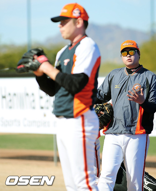 21일(한국시간) 미국 애리조나주 투산 '키노 스포츠 콤플렉스'에서 진행된 한화 스프링캠프에서 새롭게 한화로 영입된 메이져리그 출신 용병 브라이언 배스가 피칭을 할때 류현진이 옆에서 말을 걸고 있다.