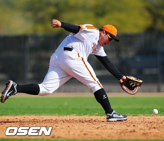 23일(한국시간) 미국 애리조나주 투산 '키노 스포츠 콤플렉스'에서 진행된 한화 스프링캠프에서 김태균이 수비훈련 중 볼을 놓치고 있다.