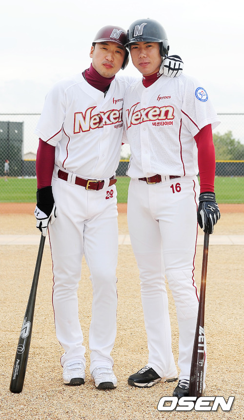 24일(한국시간) 미국 애리조나주 서프라이즈 '텍사스 레인져스 볼파크'에서 진행된 넥센 스프링캠프에서 타격연습을 기다리던 이택근과 강정호가 함께 다정한 포즈를 취하고 있다.