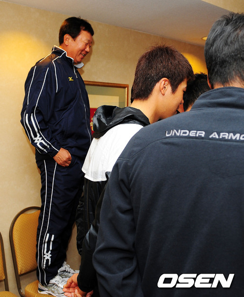 24일(한국시간) 미국 애리조나주 서프라이즈 KIA 스프링캠프 숙소에서 설맞이 윷놀이 행사가 열렸다. 선동렬 감독이 의자에 올라가서 선수들의 윷놀이를 구경하고 있다.