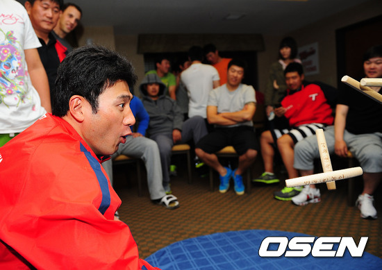 24일(한국시간) 미국 애리조나주 서프라이즈 KIA 스프링캠프 숙소에서 설맞이 윷놀이 행사가 열렸다. 서재응이 윷놀이를 던지며 심각한 표정을 짓고 있다.