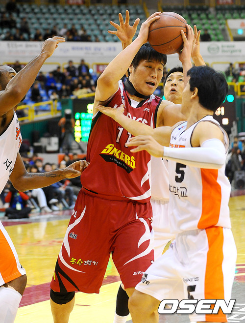 24일 오후 경남 창원시 두대동 창원실내체육관서 열린 '2011~2012 KB국민카드 프로농구' 창원 LG와 인천 전자랜드의 경기 2쿼터 LG 서장훈이 리바운드 성공하고 있다.