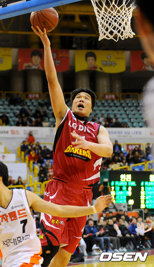 24일 오후 경남 창원시 두대동 창원실내체육관서 열린 '2011~2012 KB국민카드 프로농구' 창원 LG와 인천 전자랜드의 경기 2쿼터 LG 서장훈이 레이업슛을 시도하고 있다.