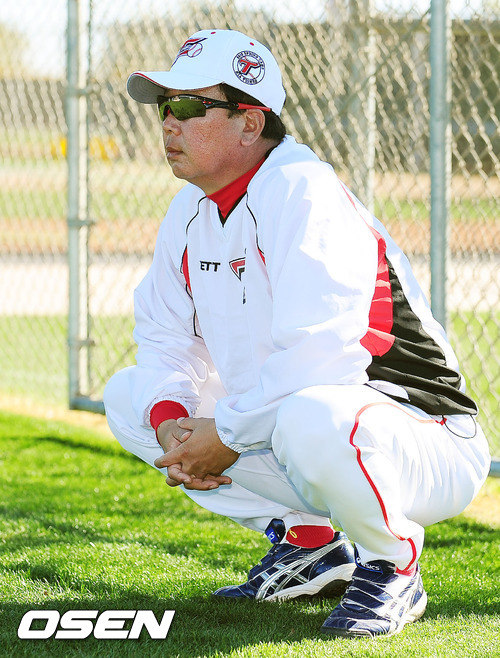25일(한국시간) 미국 애리조나주 서프라이즈 '캔자스시티 로열스 컴플렉스'에서 진행된 KIA 스프링캠프에서 선동렬 감독이 앉아서 피칭훈련을 지켜보고 있다.